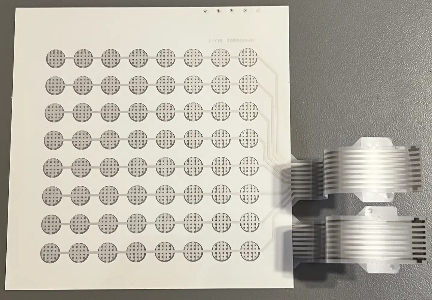 Das Keypad (und die Overlays)Neben den acht generischen Tasten der ersten Reihe gibt es 'Game Overlays' für fünf von den zehn MBX-Spielen. Diese stellen Direktfunktionen bereit, die das 'Gameplay' verbessern sollen... oder ist es eher deswegen, weil die TI-Tastatur dem TI-MBX Interface in die Quere kommen kann? Egal - hilft ja nix...Das Keypad ist eines der Klasse "Schaltmatte", es hat keinen Druckpunkt, und wird mittels eines eigenen Rahmens und 8 Führungsstegen im unteren Deckelteil korrekt ausgerichtet. Es funktioniert ähnlich wie die TI-Joysticks, mit den ähnlichen Problemen: Abrieb und Korrosion der (Silber-)Leitschicht. Das kann man auf den Bildern schon sehen. Es verfügt über vier Ebenen/Layer, die durch fünf Stanzungen oben links an ihrer Position zueinander fixiert werden: