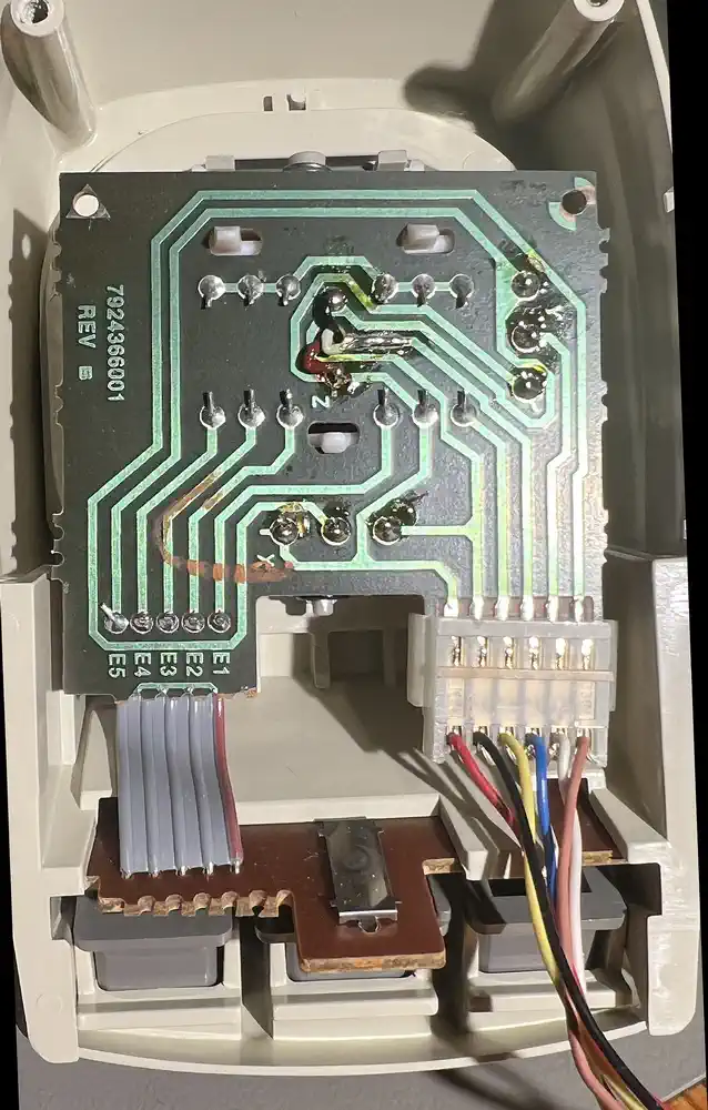 Die JoysticksDas ist der eigentlich wirklich knifflige Teil beim Nachbau eines MBX, auch wenn das am Anfang vielleicht nicht so aussieht. Das betrifft natürlich zunächst die Elektronik - den kompletten Griff per 3D-Druck zu erzeugen, könnte aber auch spannend sein...Schauen wir uns die Dinger erst einmal an: Ein 3-Achsen Joystick mit Rotation der z-Achse (des Hebels/Griffs), für dessen Erfassung je ein Poti pro 'Achse' zwischen Masse und +5V abgegriffen und intern per ADC verarbeitet wird. Dazu 4 Tasten, die über verschiedene Widerstände gegen Masse schalten. Vom 9-Pin Stecker werden 6 Pins genutzt (Pin-Nummern sind diejenigen der PCB, Pin #1 ist auf dem Bild der linke Kontakt mit dem roten Draht):