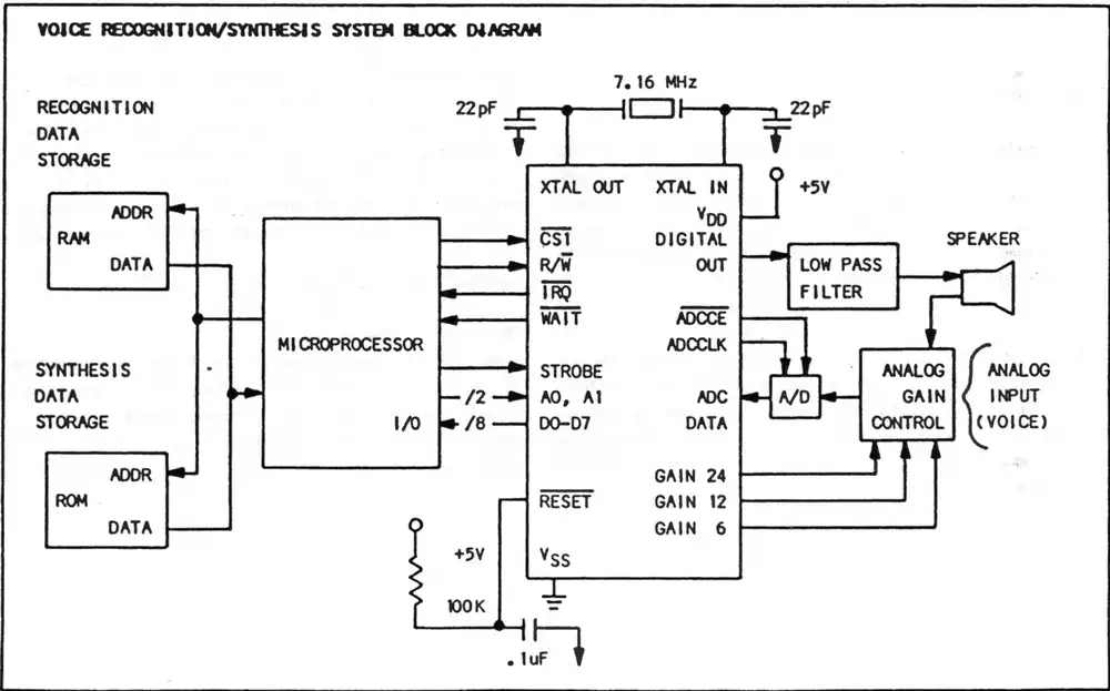 Der SP1000Der SP1000 gehört(e) zur 'Speech Family' Linie von General Instruments, und der Lis'ner kann z.B. mit einem SSI263 Phonem-Sprachsynthesizer erweitert werden - näheres kann man dem Handbuch der Apple-II Variante entnehmen.Was der Lis'ner nicht kann, ist der Vergleich gegen vom Anwender eingesprochene Worte - das kann aber das MBX! Im MBX wird der SP1000 für die LPC-Sprachausgabe und für die LPC-basierte Spracherkennung eingesetzt. Bis auf weiteres bleibt es bei dem rechts zu findenden Bild aus dem Datenblatt mit einer minimalen Anwendung eines Erkennungs-/Ausgabesystems mit Mikroprozessor. Der SP1000 ist aktuell noch relativ gut verfügbar, zu Stückpreisen zwischen 10,- und 15,- Euro (plus Porto). Kniffliger wird es bei der Taktversorgung, zumindest wenn man 'originalgetreu' bleiben will, denn die Keramikschwinger von Murata sind zwar lieferbar, aber die 7,16 MHz machen die Sache knifflig... ich habe die Dinger in Australien gefunden, und sie waren selbst mit Porto recht günstig (günstiger zumindest als bei Mouser, Digikey oder anderen Distributoren - da machen die Mindermengenzuschläge dem Spaß ein Ende). Wenn er seinen eigenen Takt generiert, liefert er ein 3,58 MHz Signal für einen Mikroprozesser ab, ansonsten kann man diese 3,58 MHz auch direkt einspeisen und spart sich den Baustein. |