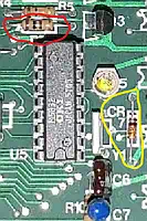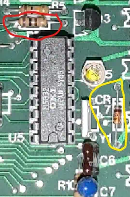 At some time after initial release, someone probably noticed the issue, and during a board revision R7 was replaced with a diode, the layout and the silkprint were re-worked, and the spot for R7 was - consequently? - renamed to CR7 - not recognizing that there was already a CR7 on the board, so now we have two CR7's... I'm out of words (image to the right). If you own such an old one with R7, you may safely replace it with a 1N4148 or the like, but observe the direction! |