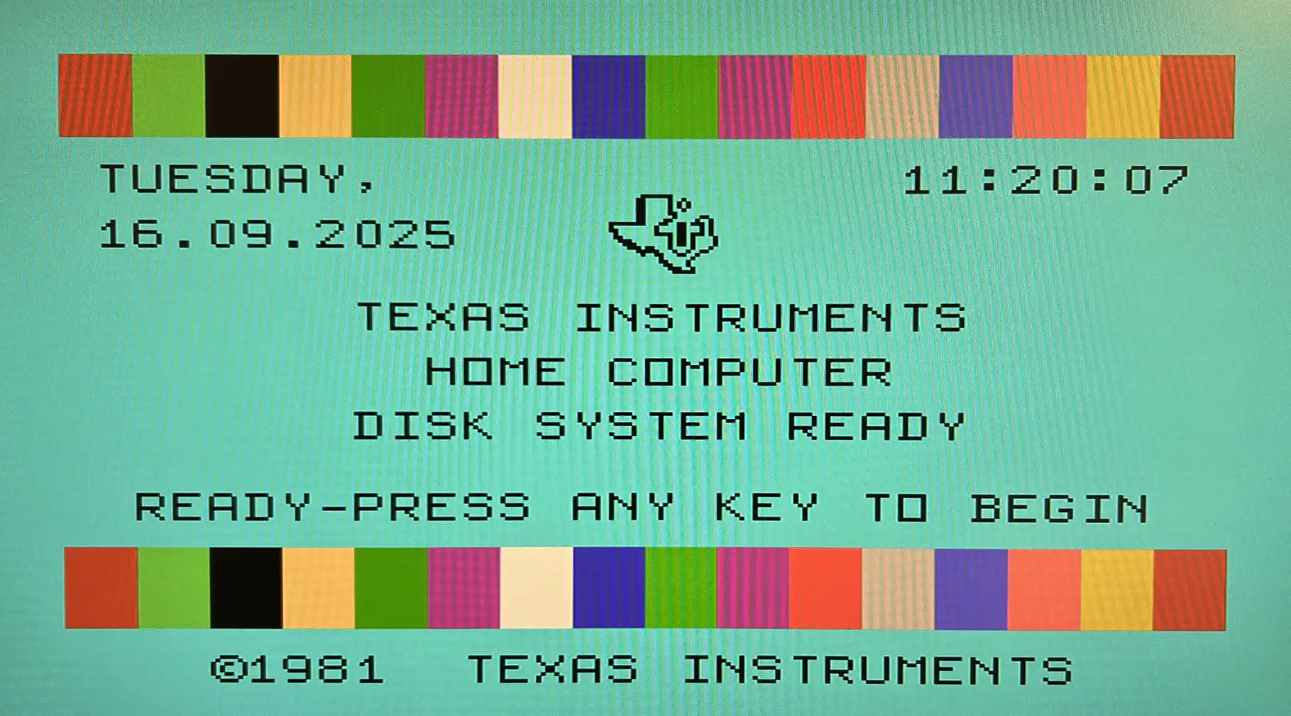 In any case: somewhere else! I'd prefer the charactor row below the colour bar - left hand side the date, right hand side the time - each of them aligned with its outer screen boundary. Lets see... but the presumptuous "Personal Computer System" - we don't honestly need this, don't we - although at TI in those times, they often used it themselves. |