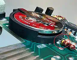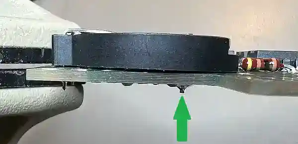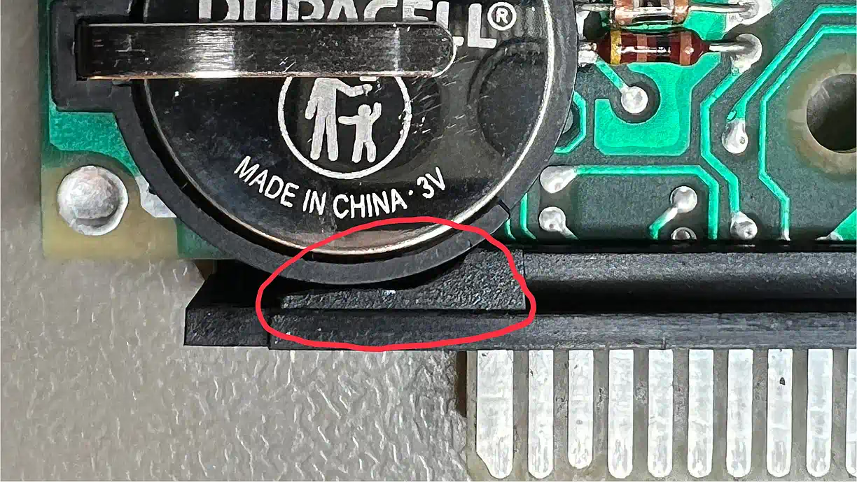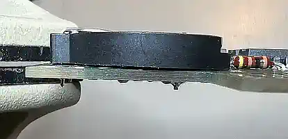 Da der Batteriehalter den Massepin nahe der Mitte hat (der Plus-Pin passt perfekt!), kann die Kontaktierung nicht dort erfolgen, wo bei der alten Batterie die Lötfahne kontaktiert wurde. Glücklicherweise ist genau dort, wo bei diesem Halter der Massepin ist, eine Durchkontaktierung in der Massefläche. Also wird dort flugs ein Loch mit 1,3mm Durchmesser gebohrt (es gibt noch genug andere Dukos, die das abfangen) und die Fassung eingelötet... ABER HALT! Da stimmt doch was nicht! - flach geht doch anders. |