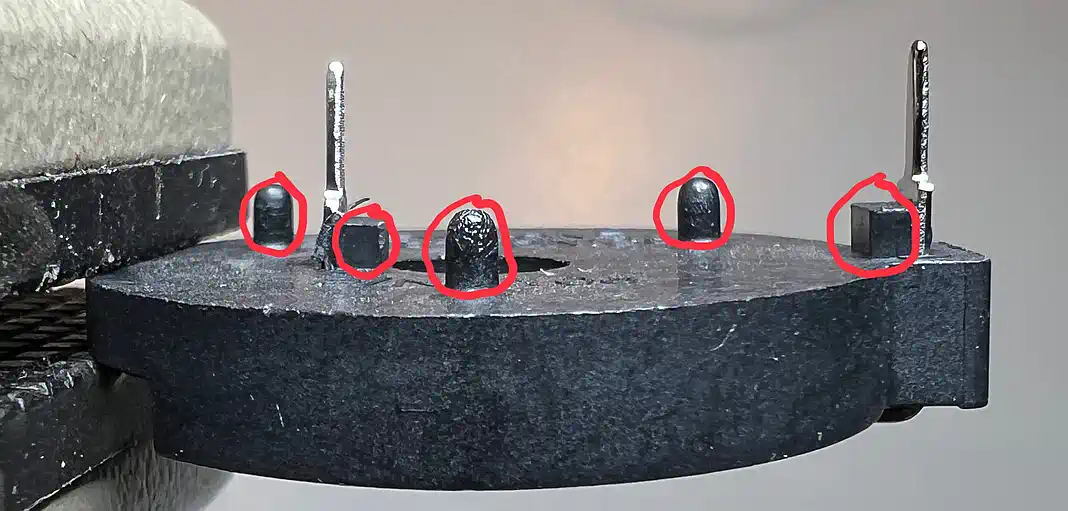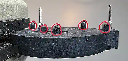 | Der Halter muss flach aufliegen, und die Halteklammer darf nicht nach oben ragen. Daher muss die Halteklammer flach gebogen werden und die Abstandsstifte müssen glatt am Boden des Halters abgeschnitten werden. |