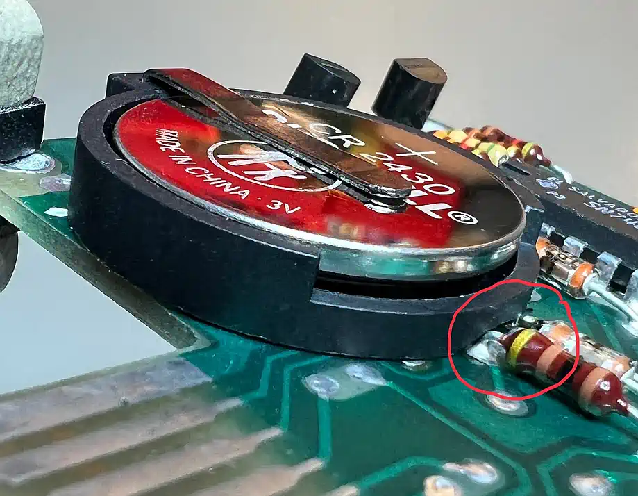 | Und in der Tat drücken drei Bauteile rechts vom Halter diesen nach oben - der Deckel des Gehäuses lässt sich so nicht schließen. An den rot markieren Stellen muss also der Kunststoff etwas abgefräst werden, damit der Halter wirklich plan aufliegt. Und - fertig!? Nein, noch nicht, denn man kann es auf den Bildern schon ahnen: der Batteriehalter ragt über die Platine hinaus! |