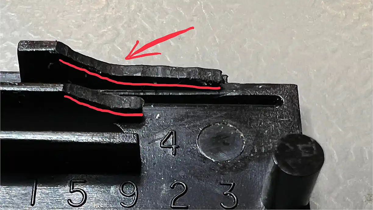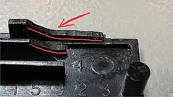 Die Stunde der Wahrheit kam beim Zusammenbau - wohin mit der Portabdeckung, wenn das Modul eingesteckt ist? Es stößt am Halter an - Mist! Also muss Material weg - aber vorsichtig, denn an dieser Stelle befindet sich die Führung für die Drehfeder, durch die das Modulgehäuse im ausgesteckten Zustand geschützt wird. Diese Nut darf also nicht (ganz) zerstört werden. Als Anhaltspunkt seien die roten Linien gegeben - man sollte den Vorgang aber durch laufendes Prüfen der Passung absichern. |