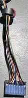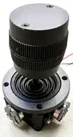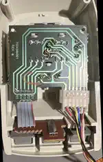 Die JoysticksDas ist der eigentlich wirklich knifflige Teil beim Nachbau eines MBX, auch wenn das am Anfang vielleicht nicht so aussieht. Das betrifft natürlich zunächst die Elektronik - den kompletten Griff per 3D-Druck zu erzeugen, könnte aber auch spannend sein...Schauen wir uns die Dinger erst einmal an: Ein 3-Achsen Joystick mit Rotation der z-Achse (des Hebels/Griffs), für dessen Erfassung je ein Poti pro 'Achse' zwischen Masse und +5V abgegriffen und intern per ADC verarbeitet wird. Dazu 4 Tasten, die über verschiedene Widerstände gegen Masse schalten. Vom 9-Pin Stecker werden 6 Pins genutzt (Pin-Nummern sind diejenigen der PCB, Pin #1 ist auf dem Bild der linke Kontakt mit dem roten Draht):