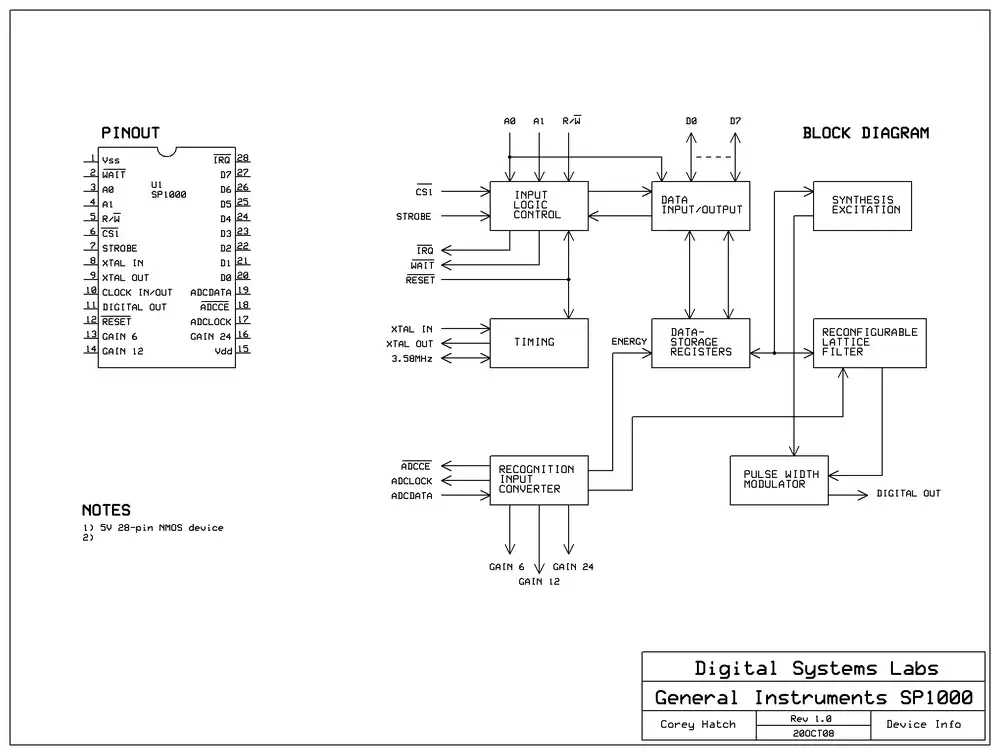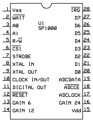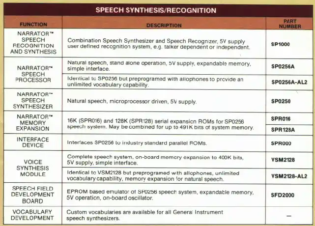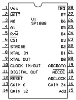 Der SP1000Der SP1000 gehört(e) zur 'Speech Family' Linie von General Instruments, und der Lis'ner kann z.B. mit einem SSI263 Phonem-Sprachsynthesizer erweitert werden - näheres kann man dem Handbuch der Apple-II Variante entnehmen.Was der Lis'ner nicht kann, ist der Vergleich gegen vom Anwender eingesprochene Worte - das kann aber das MBX! Im MBX wird der SP1000 für die LPC-Sprachausgabe und für die LPC-basierte Spracherkennung eingesetzt. Bis auf weiteres bleibt es bei dem rechts zu findenden Bild aus dem Datenblatt mit einer minimalen Anwendung eines Erkennungs-/Ausgabesystems mit Mikroprozessor. Der SP1000 ist aktuell noch relativ gut verfügbar, zu Stückpreisen zwischen 10,- und 15,- Euro (plus Porto). Kniffliger wird es bei der Taktversorgung, zumindest wenn man 'originalgetreu' bleiben will, denn die Keramikschwinger von Murata sind zwar lieferbar, aber die 7,16 MHz machen die Sache knifflig... ich habe die Dinger in Australien gefunden, und sie waren selbst mit Porto recht günstig (günstiger zumindest als bei Mouser, Digikey oder anderen Distributoren - da machen die Mindermengenzuschläge dem Spaß ein Ende). Wenn er seinen eigenen Takt generiert, liefert er ein 3,58 MHz Signal für einen Mikroprozesser ab, ansonsten kann man diese 3,58 MHz auch direkt einspeisen und spart sich den Baustein. |