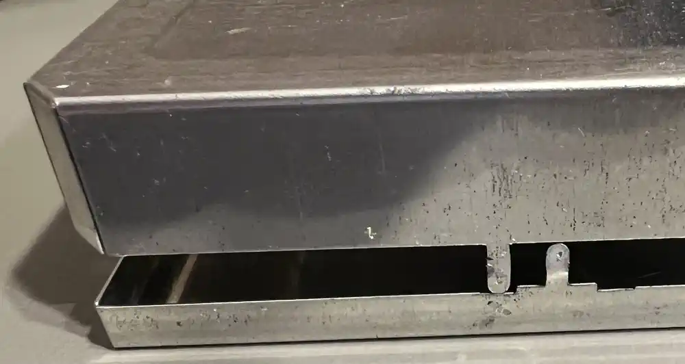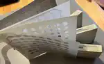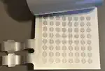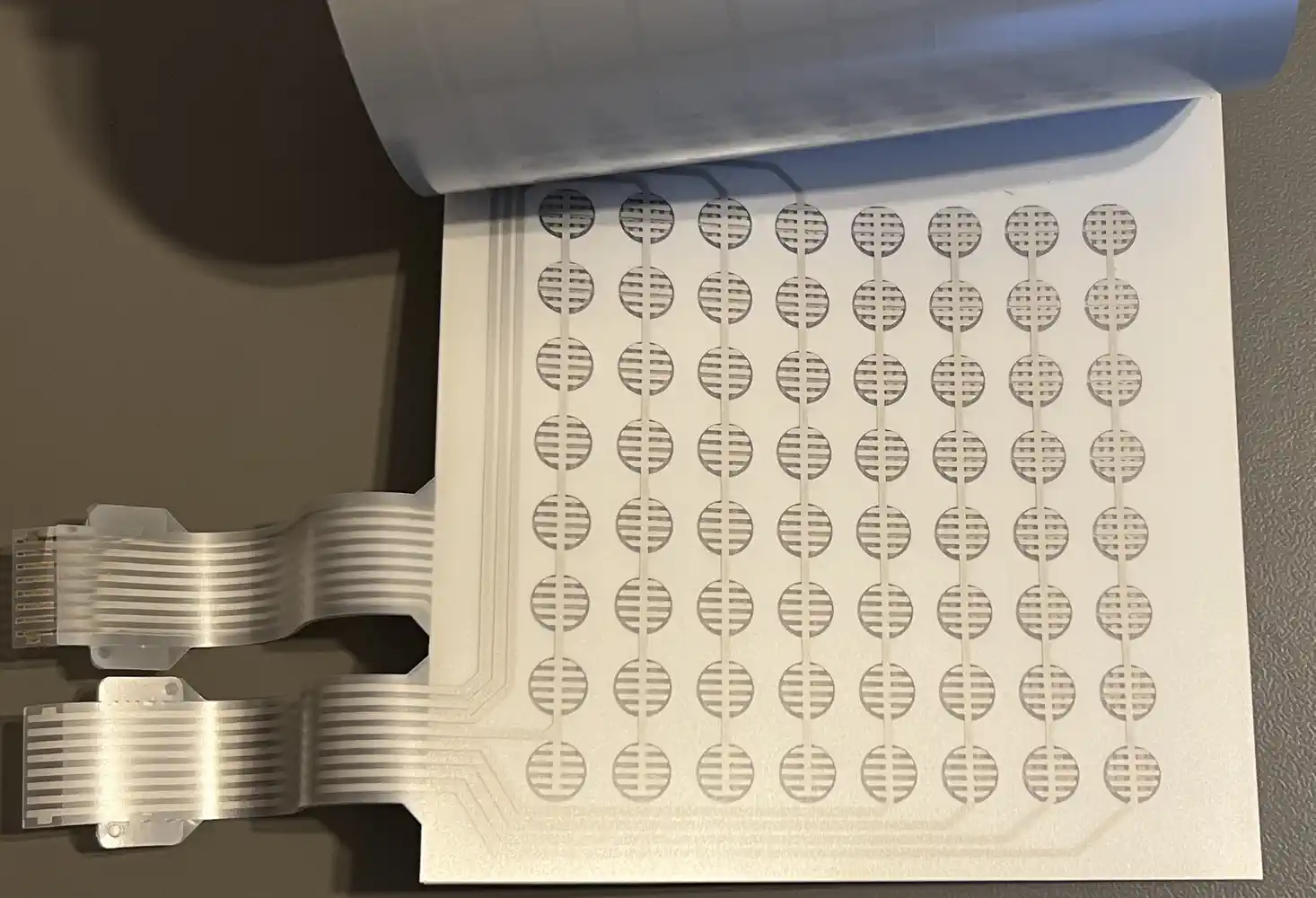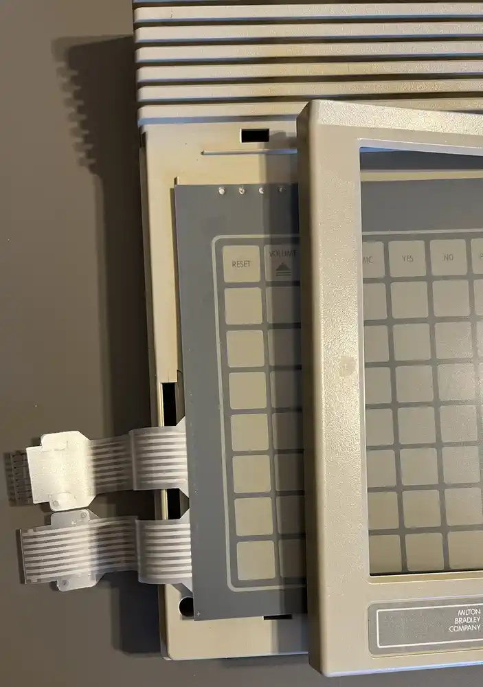 Das Keypad (und die Overlays)Neben den acht generischen Tasten der ersten Reihe gibt es 'Game Overlays' für fünf von den zehn MBX-Spielen. Diese stellen Direktfunktionen bereit, die das 'Gameplay' verbessern sollen... oder ist es eher deswegen, weil die TI-Tastatur dem TI-MBX Interface in die Quere kommen kann? Egal - hilft ja nix...Das Keypad ist eines der Klasse "Schaltmatte", es hat keinen Druckpunkt, und wird mittels eines eigenen Rahmens und 8 Führungsstegen im unteren Deckelteil korrekt ausgerichtet. Es funktioniert ähnlich wie die TI-Joysticks, mit den ähnlichen Problemen: Abrieb und Korrosion der (Silber-)Leitschicht. Das kann man auf den Bildern schon sehen. Es verfügt über vier Ebenen/Layer, die durch fünf Stanzungen oben links an ihrer Position zueinander fixiert werden: