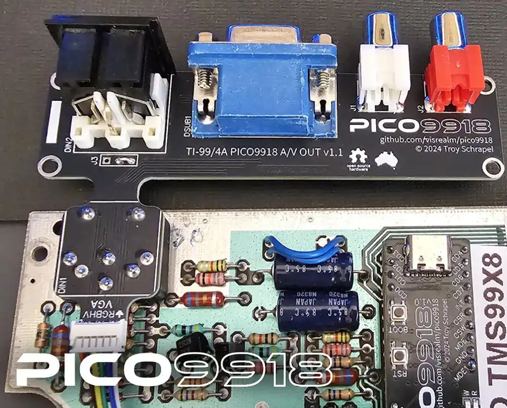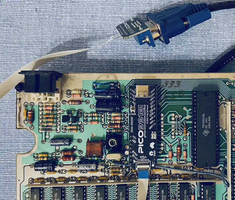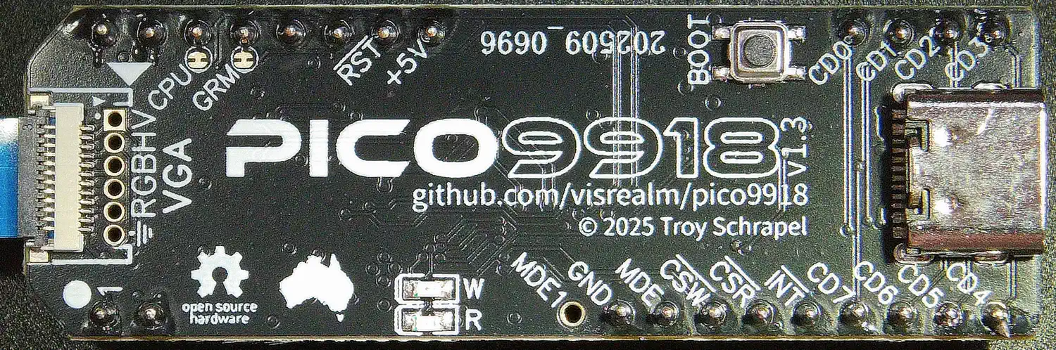 Wer im Jahr 2025 nach verfügbarer neuer Hardware für den TI-99/4A suchte, ist nicht immer erfolgreich... Viele hochinteressante Projekte begannen oder endeten um die Jahrtausendwende, und diejenigen die damals begannen, waren noch vor etwa 10 Jahren verfügbar, und tauchen aktuell gar nicht mehr oder nur noch sehr selten gebraucht, und dann aber zu völlig sinnfreien Preisen auf - so z.B. die NanoPEB, die CF7-Variante davon, der F18A VDP und ähnliches. Da war es eine große Überraschung, eine aktuelle Quelle für einen hochinteressanten VDP-Ersatz zu finden, nämlich den Pico9918 von Troy Schrapel aus Australien, der auch heute noch neu produziert und weiterentwickelt wird. Kurz gesagt handelt es sich um einen Raspberry Pi Pico auf Basis des Broadcom 2040 Chips, der einen TMS9918A/9929A VDP UND einen F18A vollständig in Software emuliert, und als Ersatz für den TMS9918A gedacht ist, der in mehr Homecomputern und Spielekonsolen eingesetzt wurde, als es dem normalen TI-99/4A User in der Regel bekannt sein dürfte. Mit etwas Zusatzhardware für die Videoausgabe über einen VGA-Monitor (alles auf der kleinen Platine!) kommt aus dem Pico ein auf 640x480 hochskaliertes Bild mit 60 Hz Bildwiederholrate zustande, das sich sehen lassen kann. | |||