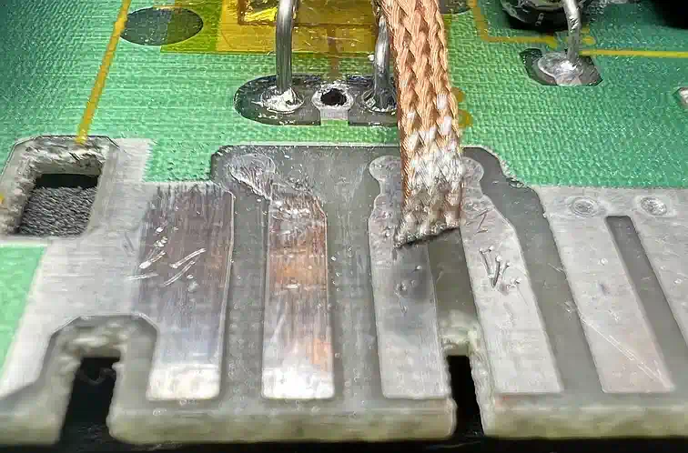 Leider fehlen mir die Chemikalien, um herauszufinden, ob die verzinnten Leiterbahnen mit irgendwas beschichtet wurden, um die Oxidation zu verhindern - Tatsache ist aber, daß sich schon alleine mit IPA einiges an Belag entfernen lässt. Richtig gut sieht es aber erst aus, wenn man Entlötlitze als Schleifmittel einsetzt. Zusätzlich erscheint es hilfreich, die Kontakte an den Klemmverbindern aufzubiegen, um einen höheren Druck zu erzeugen, und somit den Kontakt vielleicht sogar gasdicht zu bekommen. Den Rest mögen die Bilder zeigen...