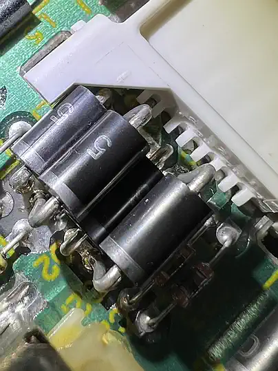 (Auf dem Bild sind die Dioden schon ersetzt...) Wer mit einer Rework-Station an das Auslöten geht, sollte besser gleich die Spitze mit dem dickeren Loch nehmen - spätestens bei den 1N5401 passen die meisten Standardspitzen nicht mehr.