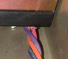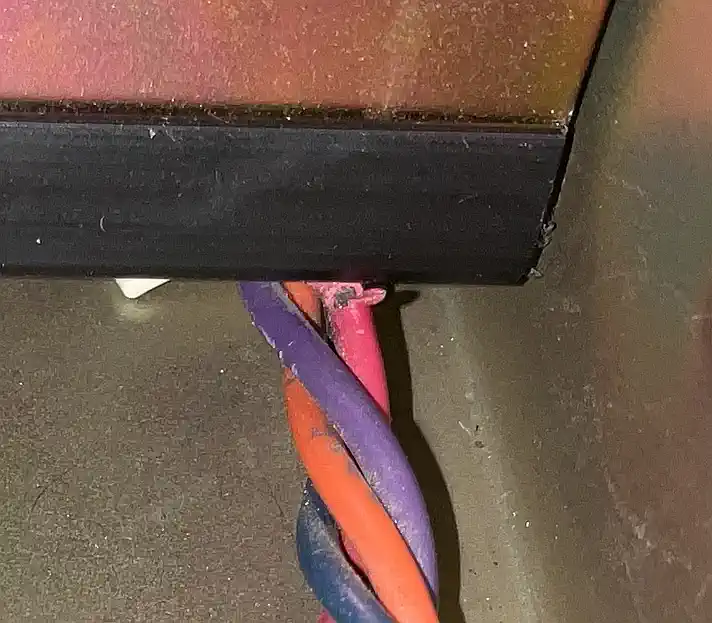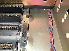 Nachdem die Box komplett zerlegt war, fiel mein Blick auf das Kabel der Stromversorgung für die Floppies. Man bekommt ja recht schnell mit, daß EIN Design-Kriterium bei der Konzeption der PEB definitiv KEINE Rolle gespielt hat: das Vermeiden scharfer Kanten! Und davon gibt es mindestens 2, die mehr als ärgerlich sind. Dort wo die Floppy-Versorgung aus dem Netzteil heraus geführt wird, war die Isolierung des Kabels defekt! Das wurde isoliert, und die scharfe Kante wurde entschärft. Genau dasselbe dort, wo es ins Floppy-Abteil geht, nur war dort noch keine Isolierung angefressen. Und beim Datenkabel zu den Floppies gab es auch eine scharfe Kante - Problem erkannt, Gefahr gebannt! |