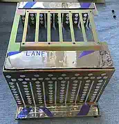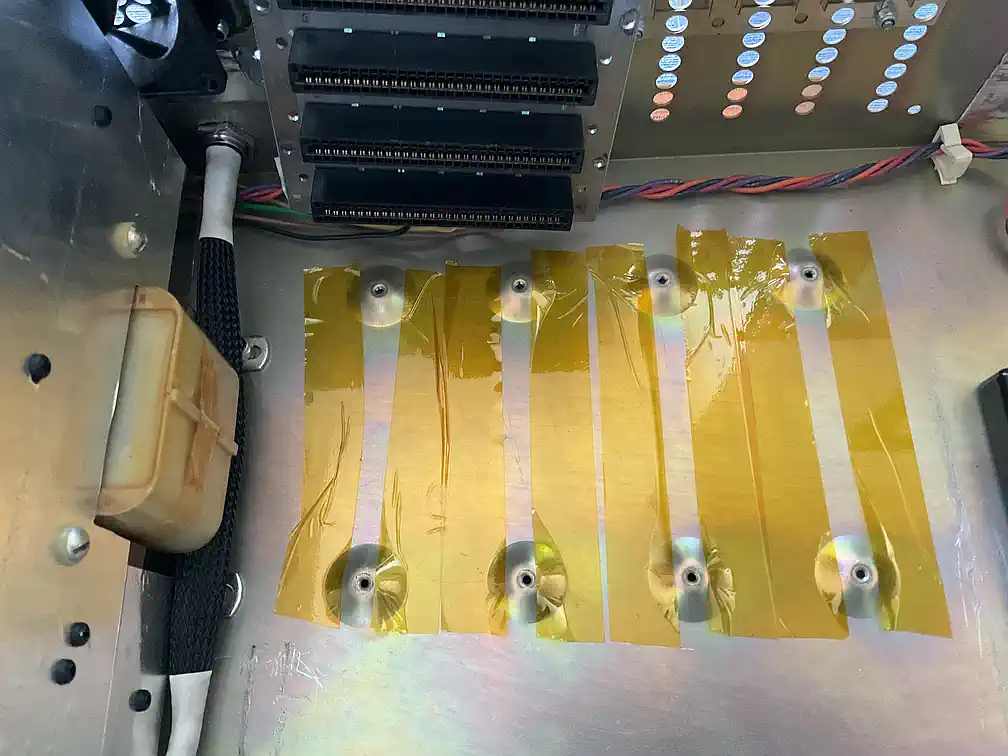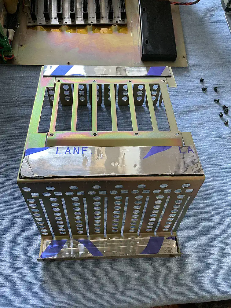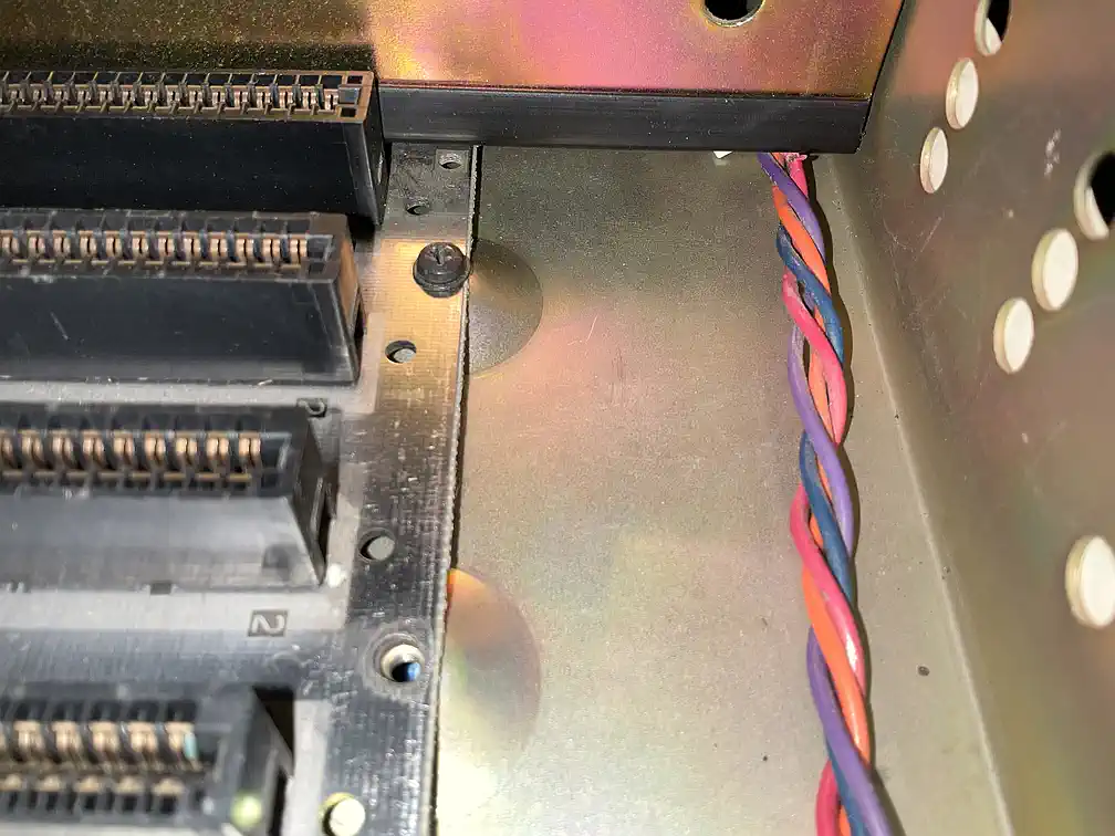 Beim Einbau des Kartenkäfigs fiel mein Blick auf den Raum zwischen Bodenplatte und Busplatine. Moment mal - ist es da nicht etwas zu knapp mit dem Abstand zwischen Steckerpins und Befestigungspunkt? Und wenn jetzt die Erde bebt, gibt es einen Kurzen??? Naja, da war es dann ich, der die TI-Ingenieure Dummköpfe genannt hat... nach Montage diverser Kapton-Streifen war klar zu sehen, daß mich die Perspektive genarrt hatte - die Pins sind zwar nahe dran, aber weit hinter den runden Kuppeln in denen die Schrauben sitzen... grmpfff. |
