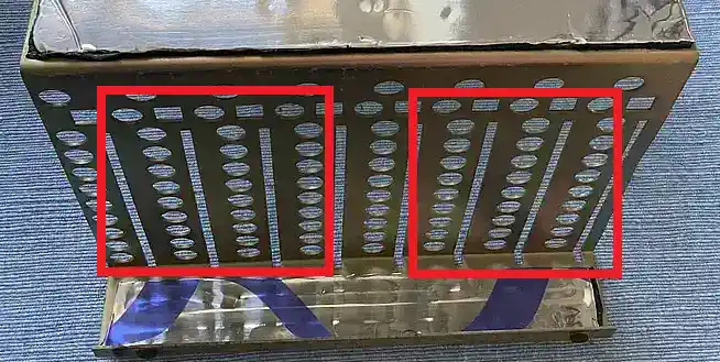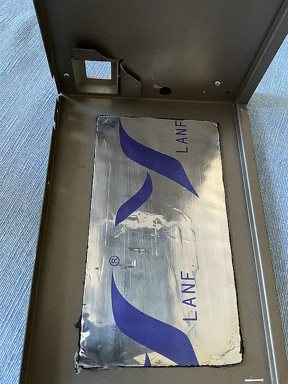 Wenn man mit einem Fingerknöchel an die seitliche rechte oder linke Außenwand der PEB klopft, scheppert es schon deutlich. Hier ist also eine Portion Alubutyl sicher gut aufgehoben... Auf den Bildern sieht man oben die rechte Seite der PEB, also das Floppy-Abteil. Hier kann man nach vorne und oben (wegen der Befestigungsschrauben für die Laufwerke) nichts tun, aber an der Seite und hinten durchaus, denn alles schwingt mit, wenn sich in der Box irgendwas tut. Darunter - erkennbar am Loch für den Netzschalter - die Seite mit dem Netzteil. Auch hier sind es die Gehäuseschwingungen, um die es geht. Im finalen Foto sieht man, wo überall man dieses klebrige Zeugs unterbringen kann... |