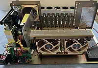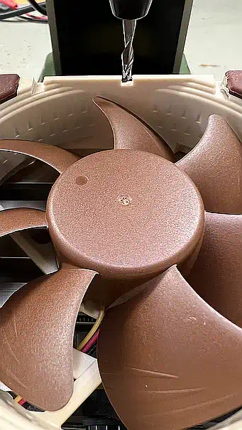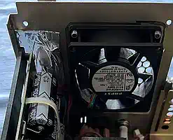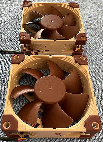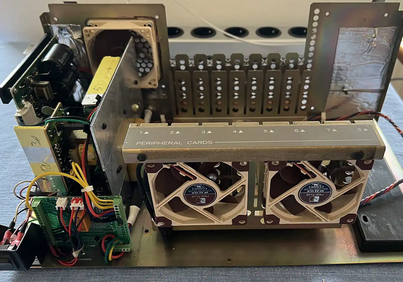 Nach dem Zusammenbau dann die Ernüchterung: Immer noch zu laut! Also wieder alles zerlegt, drei neue Noctua NF-8A ULN bestellt, den Papst 8412L rausgenommen und durch einen Noctua ersetzt, und vorne die 2 anderen NF-8A ULN eingebaut... wenn es denn so einfach wäre... war es aber nicht! Natürlich brauchte es eine neue Verkabelung, und die Löcher in der vorderen gelochten Wand hatten nicht nur den passenden Abstand, um die Lüfter aufzunehmen, sondern es konnten aufgrund des passenden Durchmessers auch die originalen Silikonschniedel (Schniedeln? Karl Valentin fragen) zum Befestigen genutzt werden... aber die Lüfter mussten flach an das Blech montiert werden, und ragten dadurch in den Schlitz, über den die Einschübe vorne geführt werden! Also mussten die eingefräst werden, was aber bedingte, daß die Stege nach vorne zeigen, da sonst der Motor abfällt, wenn die angeknabbert werden! Infolgedessen musste also der Luftstrom wieder umgekehrt werden, so daß er nun wieder über die Karten einsaugt und durch das Netzteil ausbläst. Eigentlich wollte ich das anders herum, weil dadurch die Öffnung, durch die Staub angesaugt wird, am kleinsten ist, aber gut... Die Fräsnut im Lüfter muss 3 mm breit und ca. 2 mm tief sein - die Lage zeichnet man am besten im eingebauten Zustand an. Dann die MF 70 angeworfen und schön abgefräst - fertig. Zur Info: Die originalen PEB-Karten haben eine Schiene, die etwa 3 mm vorsteht, die Dicke des Lochblechs ist etwa 1 mm, bleiben also 2 mm, die weg müssen. Die vorderen Lüfter laufen nur, wenn die PEB an ist, der hintere läuft immer, sobald der Netzstecker steckt. Der hintere Lüfter ist direkt mit 12V verbunden, die vorderen haben 100 Ohm in der Zuleitung, und es ist kein Unterschied wahrnehmbar, wenn die Box eingeschaltet wird, außer dem leicht zunehmenden Luftstrom - so wie es jetzt ist, übertönt der Trafo im Leerlauf alle 3 Lüfter, und es kommt trotzdem genug Luft raus! ÜBRIGENS: Der Noctua NF-A8 ULN, den ich vor fast genau 8 Jahren gekauft habe, hörte sich irgendwie lauter an als die neuen - seltsam... Der Grund: nein - kein Lagerschaden - er dreht einfach etwa 30 Prozent schneller und bewegt dadurch auch deutlich mehr Luft! Meiner Meinung nach wäre eine neue Produktbezeichnung durchaus angebracht. |