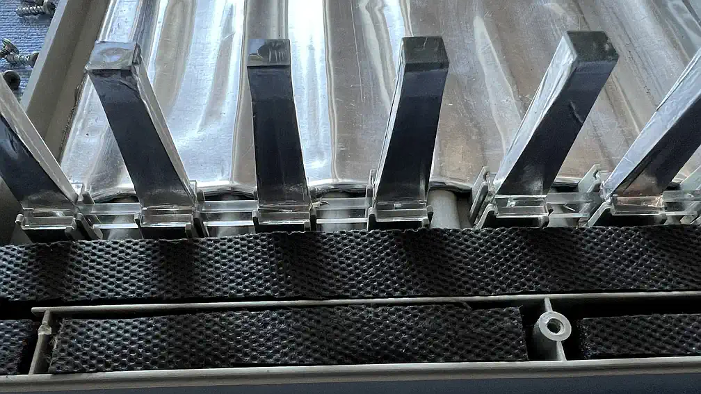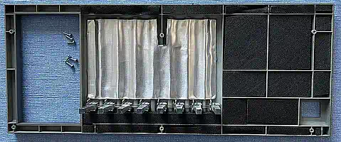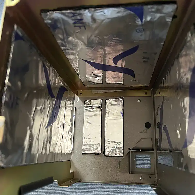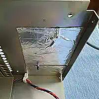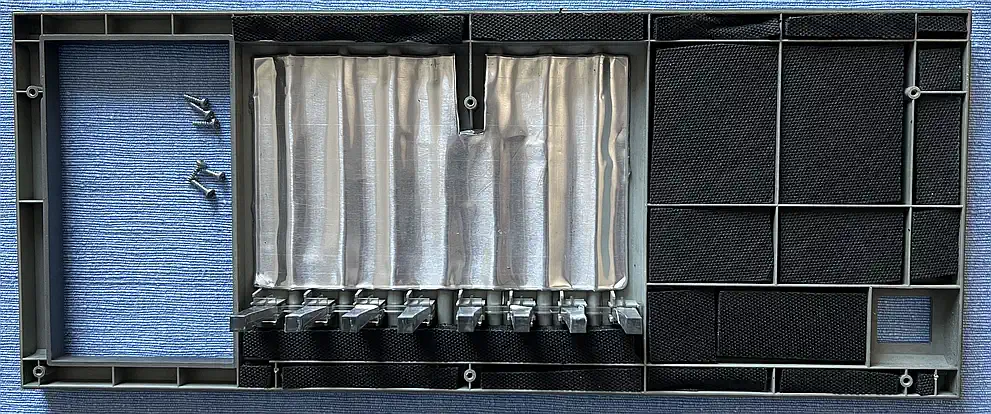 Das war definitiv die kniffligste Sache bei diesem Projekt. Ausreichende Flächen für das Alubutyl gibt es eigentlich nur oberhalb der Lichtführungen, der Rest wurde mit für PC-Gehäuse gedachten Dämmplatten gefüllt, bei denen eigentlich nur das schwere, bitumen-artige Trägermaterial und weniger die Schaumstoff-Lage für die Geräuschdämmung sorgt (jeder Akustiker weiß, daß Masse dasjenige ist, was den Körperschall maßgeblich dämmt). Aber wenn man das Ding schonmal so weit zerlegt hat, dann kommt auch noch etwas selbstklebende Alufolie an die Lichtführungen - dann wird's vorne heller... sie lassen sich sehr leicht ausklipsen. |