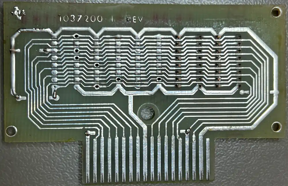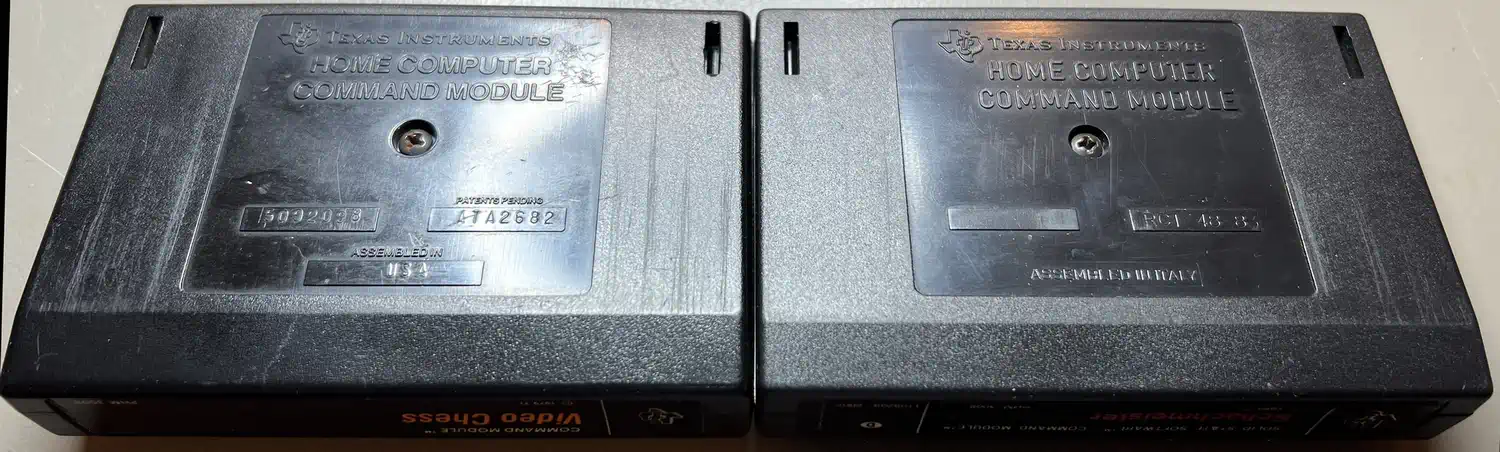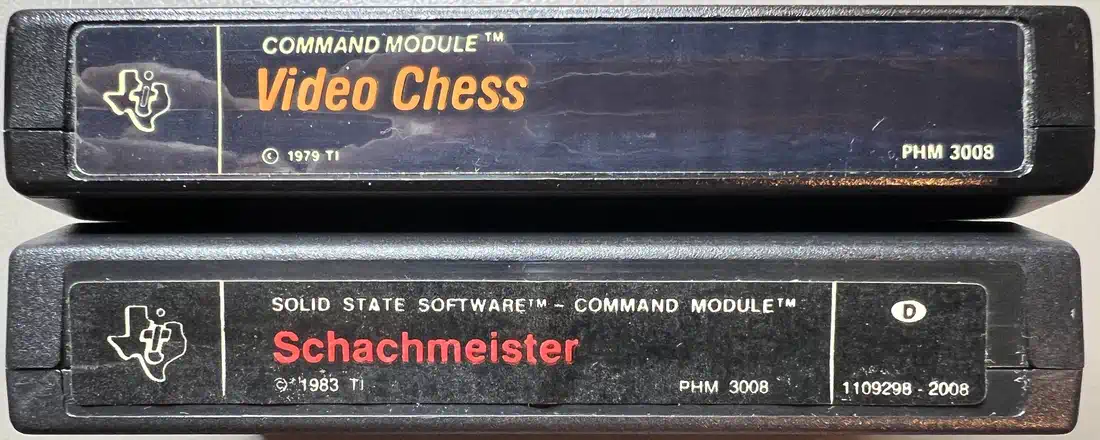 Schaut man sich die Labels und die Gehäuse an, denkt man sicher: "Video-Chess ist älter als Schachmeister, aber am Ende ist dasselbe drin." Mitnichten (die Neffen mal beiseite gelassen...), denn der Schachmeister gehört zur alten Garde der TI-99/4 Module, was auch die mit 3008 recht niedrige PHM-Nummer anzeigt. Und er zeigt das ganz unverblümt im Startbildschirm, den er ziemlich verbiegt und sich als TI-99/4 ausgibt - na gut, billiger bekommt man aktuell keinen 99/4 - oder? Aber dann wird es 'strange': Die Auswahl des Schachmeister Moduls zeigt den im 99/4 noch vorhandenen Formelrechner, der nichts anderes macht, als die im TI-Basic sowieso vorhandenen Algorithmen der 'Allgemeinheit' in angepasster Form zu präsentieren. Aber wenn man 2 drückt, kommt der Schachmeister, und beim Druck auf 3 passiert... nichts (ob es piept (sic!) kann ich aktuell mangels Audio nicht sagen). In der Anfangsanimation zeigt das '1983er' Schachmeister-Modul (Made in Italy 1983) übrigens 1979 als Copyright, während das '1979'er Video Chess (Made in USA 1982) dies unterlässt - strange indeed! Es gibt noch mehr Unterschiede, aber das kommt im Software Dies-und-Das dran. Ach ja: Die Platine ist die neue, ohne den Kurzschluss, aber mit einem Kondensator dort, wo bei Othello eine Drahtbrücke ist? |