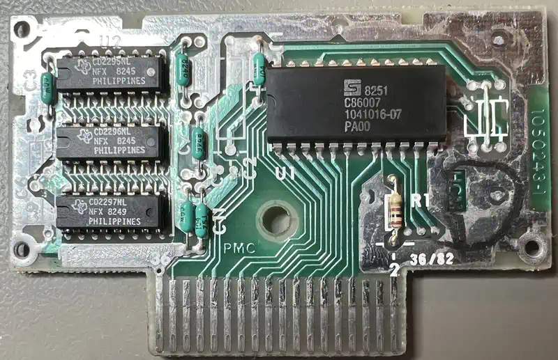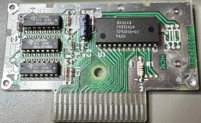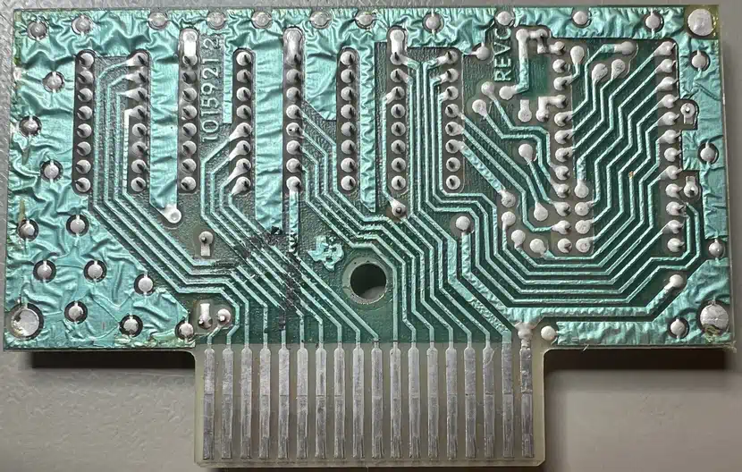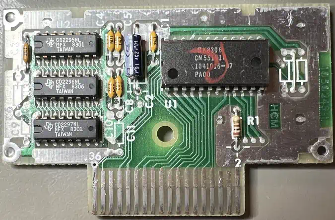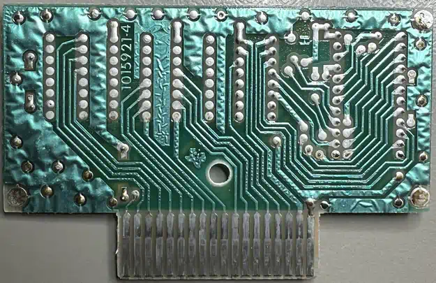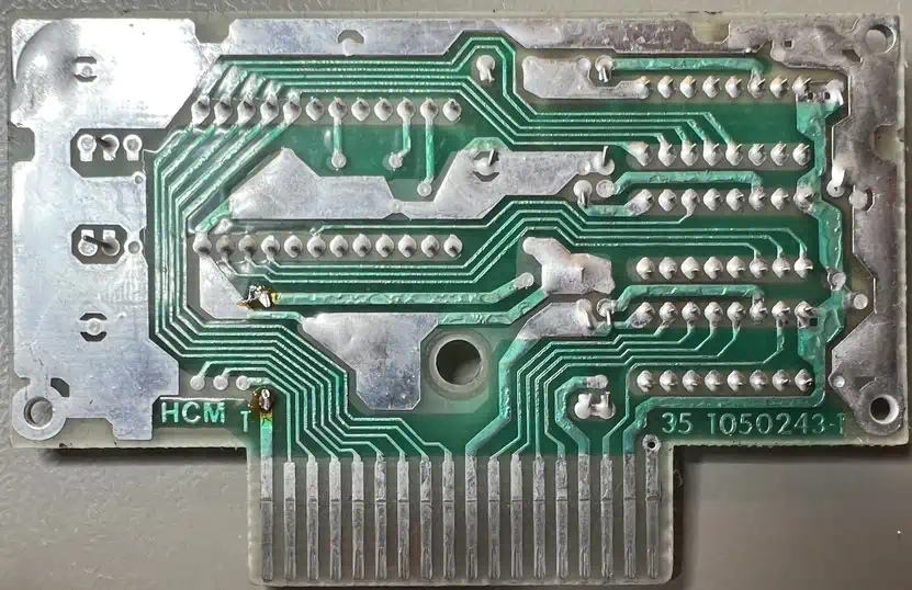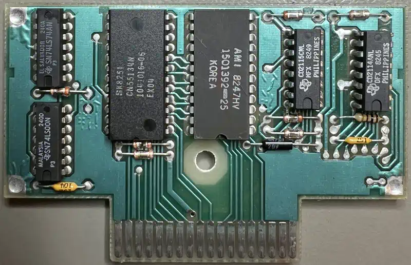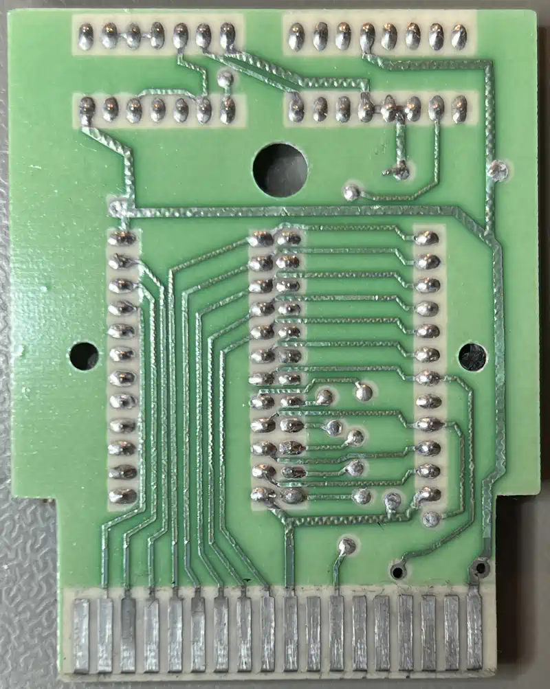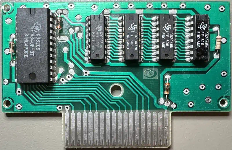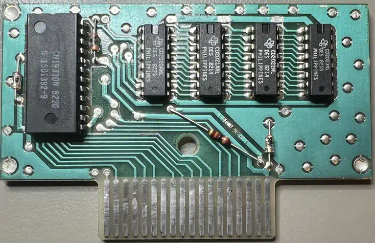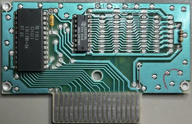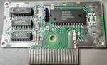 An sich nichts besonderes: drei GROMs, zwei Kondensatoren für +- 5V und ein 100 Ohm Widerstand für den Reset. Interessant ist vielleicht, daß dieses Modul die Modulauswahl übergeht, und - sobald der Startbildschirm mit dem charakteristischen Beep erscheint - nach dem Drücken irgendeiner Taste direkt die Modulsoftware startet. An diesem Punkt macht sich übrigens ein Unterschied zwischen den US-Konsolen und denen für den Rest der Welt bemerkbar: alles geht irgendwie zu langsam, was - ich muss das erst an meiner US-Konsole verifizieren - wohl an den 50Hz Interruptfrequenz des VDP liegt, denn die ist in den US-Versionen mit 60Hz bekanntermaßen 20% höher. |