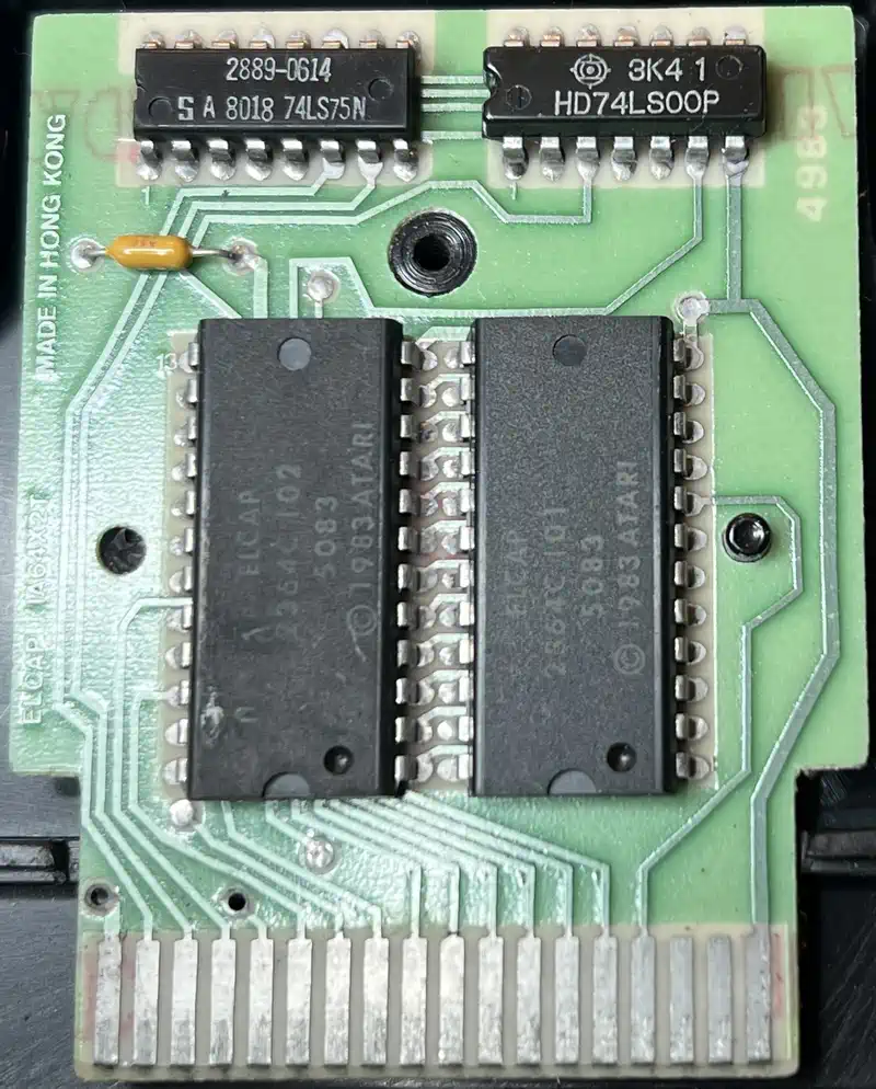 | 2 ROMs und 2 TTLs ('00: 4x NAND mit 2 Eingängen, '75: 2x 2 bistabile Latches), das ist mal der aktuelle Stand. Nicht alle Atari-Module sind verschraubt, was man recht leicht an dem Abdruck des Schraubenloches im Label erkennen kann. Ist diese Fläche glatt, dann ist das Gehäuse verschweißt! Den Schaltplan liefere ich noch... |