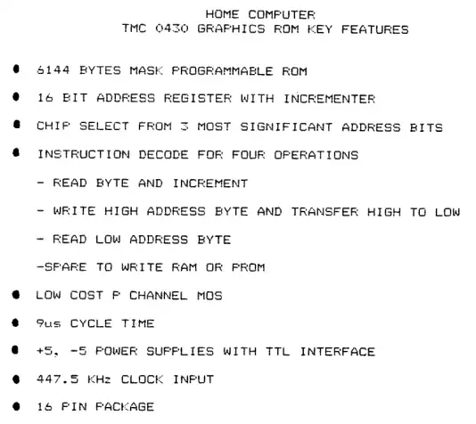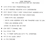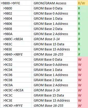 Hier kommen die Spezialitäten dran: GROM Basisadresse, Module Library etc. seien da als Stichworte schon mal gespoilert. Die nebenstehende Memory-Map (obere Graphik) zeigt die diversen Zugriffsadressen, die der TI-99/4A für den GROM-Zugriff vorsieht. Der Bereich des lesenden und schreibenden Zugriffs wiederholt sich pro Funktion alle 4 Byte, was bedeutet, daß es im gesamten Adressbereich von >9800 bis >9FFE (danach kommt der Memory-Block 5) insgesamt 256 GROM-Basisadressen gibt. Daraus und aus der Tatsache, daß die 6KB pro GROM historisch-technisch bedingt sind, folgt ein adressierbarer GROM/GRAM-Speicher von theoretisch 16MB (256 * 64KB). Theoretisch deshalb, weil die 3 TI-Basic GROMs innerhalb der Konsole auf allen Basisadressen reagieren und somit 24KB von den möglichen 64KB jeder Basisadresse wegnehmen. Aber diese Feinheiten, und wie man sie umgehen kann, damit dann echte 16MB bereitstehen, lassen wir hier beiseite - dazu gibt es ein separates Hardware-Projekt. Und in dem zu diesem analogen Projekt in der Software-Ecke wird dann auch erklärt, WARUM die 3 TI-Basic GROMs immer verfügbar sind! Die Basisadresse ist für den GROM-Chip selbst übrigens irrelevant bzw. transparent - das muss durch die Decodierung 'außerhalb' des Chips erledigt werden. Zu beachten ist auch, daß das TI-Monitorprogramm nur die ersten 16 Basisadressen scannt, und bei Vorliegen von GROM auf einer anderen als der Standardadresse >9800 den Text 'Review Module Library' anzeigt, womit man sich dann durch die ersten 16 Bereiche arbeiten kann. Jedes GROM verfügt übrigens über einen eigenen 16 Bit breiten Adresszähler der GROM-Adresse sowie über einen Adressdecoder, der jedes GROM nur auf exakt einem festgelegten 8KB Block im Adressraum der jeweiligen Basisadresse aktiviert. Siehe hierzu auch Punkt 3 in der unteren Graphik mit den Spezifikationen der GROMs. Deswegen können alle GROMs einer Basisadresse an allen Pins identisch angesteuert werden - sie 'wissen' selbst, wann sie dran sind. Dieses Verhalten ist aber auch aus einem anderen Grund erforderlich: beim Lesen der aktuellen GROM-Adresse liefern ALLE GROMs der aktuellen Basisadresse den internen Zählerstand ab - wäre das nicht so, gäbe es regelmäßige Kurzschlüsse, mit anderen Worten: es würde gar nichts funktionieren! Man könnte hier sogar noch weiter in die Details gehen, und sich mit der PMOS-Technologie, auf denen die GROMs aufbauen, auseinandersetzen, um dann besser zu verstehen, WIE hilfreich das GROM-Ready Signal wirklich ist - aber das wird in der Doku auch irgendwo behandelt. Ein genauerer Blick in die Specs zeigt übrigens, daß in der Tat schon beim initialen Design an ein GRAM gedacht wurde: "-SPARE TO WRITE RAM OR PROM" - klar, ne?! Am Ende sollte sich das Teil gar selbst programmieren können... Eine Anmerkung zur o.a. GROM-Memory-Map darf hier nicht fehlen: Wenn man eine snug HSGPL in der PEB hat, sind die Bereiche jenseits der 16 vom Monitorprogramm unterstützten Basisadressen nicht uneingeschränkt verfügbar, da einige für die Programmierung der FLASH-EPROMs auf der Karte benötigt werden. Hierzu lese man die Anleitung zu dieser Karte - Michael hat darin viele hilfreiche Informationen zusammengetragen. |