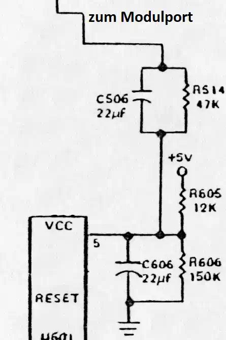Wer genau hinsieht kann erkennen, daß die Reset-Leitung, die bekanntlich über 100 Ohm an -5V gezogen wird, durchgebrannt ist! Warum? Naja, da hat jemand einen Kurzschluss gebaut, und die -5V des Netzteils hatten genug Power (sic!), um die Leiterbahn durchbrennen zu lassen. Das hat man dann mit dem 100 Ohm Widerstand (der sich nicht einsparen ließ) wieder gerichtet, und bei Othello (PCB Rev4) sieht man dann die Revision. ... oder war dieses Modul, das zu den frühesten des TI-99 gehört, in dieser Form am TI-99/4 lauffähig, weil dessen Reset-Hardware anders ist? Wenn man sich den Reset-Schaltkreis ansieht, wird es klarer: der Reset-Pin 5 des Taktgenerators U601 (nur dieser ERZEUGT den Reset - die CPU bekommt Reset von hier) ist zwar recht hochohmig angeschlossen, aber der Kondensator geht mit Plus Richtung Modulport (nach oben raus). Wenn man ihm also direkt kontaktiert, klebt seine Anode über den Draht fest an -5V, die Kathode (und in diesem Moment ist es richtig, von Anode und Kathode zu sprechen, da Elkos ähnlich einer Diode reagieren, wenn man sie verpolt) liegt an +5V - in der Folge fließt ein Strom durch den Taktgenerator und irgendwann gibt einer nach - hier eben die Leiterbahn. |