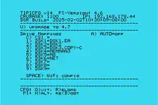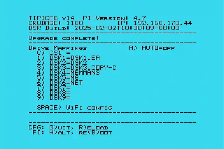 Der zentrale "Anlaufpunkt" ist der Aufruf von TIPI in TI-Basic: CALL TIPI Das (der Aufruf ohne Parameter) startet die Konfiguration des Systems, wobei CALL TIPI eigentlich nichts anderes ist als ein Loader für Program Files, dem man bei Bedarf den vollständigen Pfad eines auf dem PI gespeicherten P-Files mitgeben kann. So kommt man z.B. mit CALL TIPI("TIPI.NET.TELNET") in den Telnet-Client, der (mit einem PICO9918) 40, 64 und 80 Zeichen pro Zeile nutzen kann. Dabei ist TIPI das Wurzelverzeichnis, NET das Unterverzeichnis, und TELNET ein Program-File, das den Client enthält. Und jetzt wird auch klar, warum der TIPI zusammen mit der 32K-Speichererweiterung daherkommt: alle diese Programme laufen natürlich nur mit 32K! Und wenn man schon mal den Telnet-Client laufen hat (Name und PW beide Male: tipi), dann kann man gleich die Startpartition bis zu den Grenzen der SD-Karte erweitern: