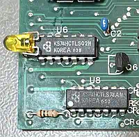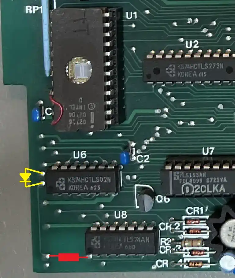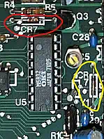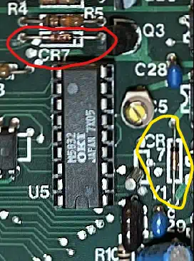 At some time after initial release, someone probably noticed the issue, and during a board revision R7 was replaced with a diode, the layout and the silkprint were re-worked, and the spot for R7 was - consequently? - renamed to CR7 - not recognizing that there was already a CR7 on the board, so now we have two CR7's... I'm out of words (image to the right). If you own such an old one with R7, you may safely replace it with a 1N4148 or the like, but observe the direction! |