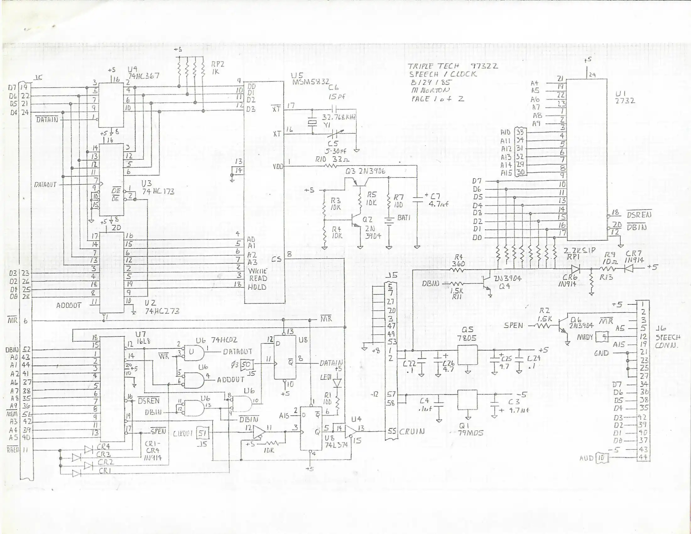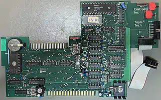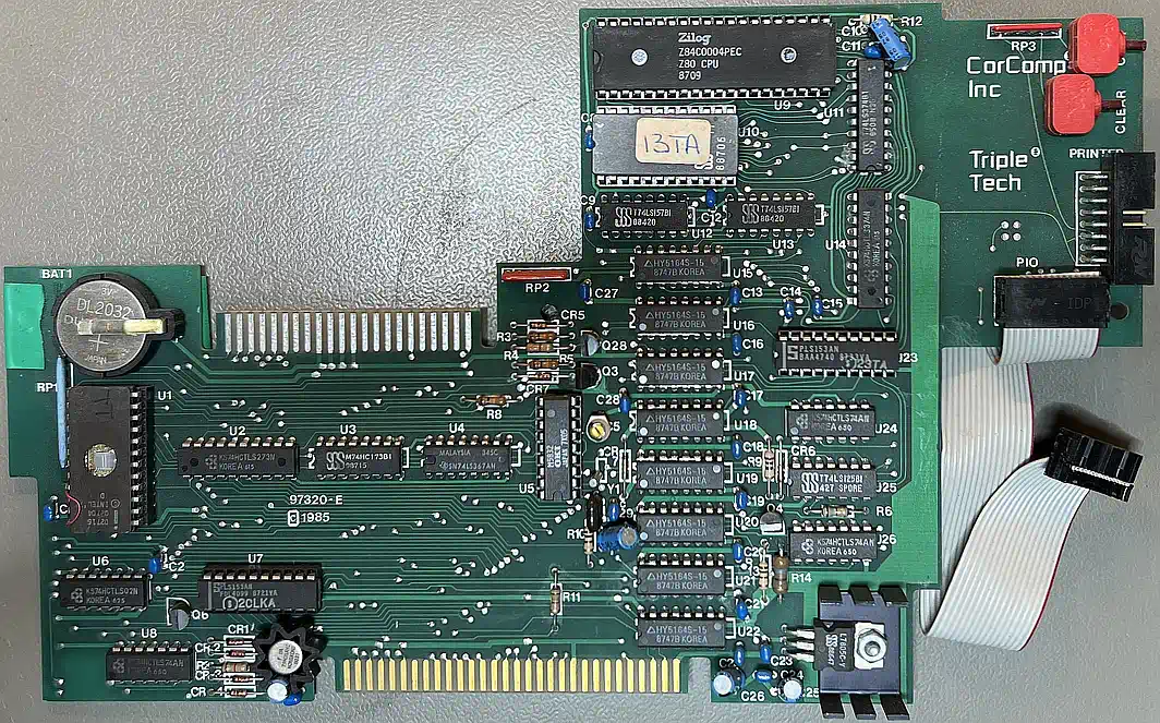 The CorComp TripleTech combines a printer buffer/spooler based on a Z80 with its own 64KB DRAM, a battery backed clock and a connector for the TI Speech-Synthesizer - all on one PEB board.