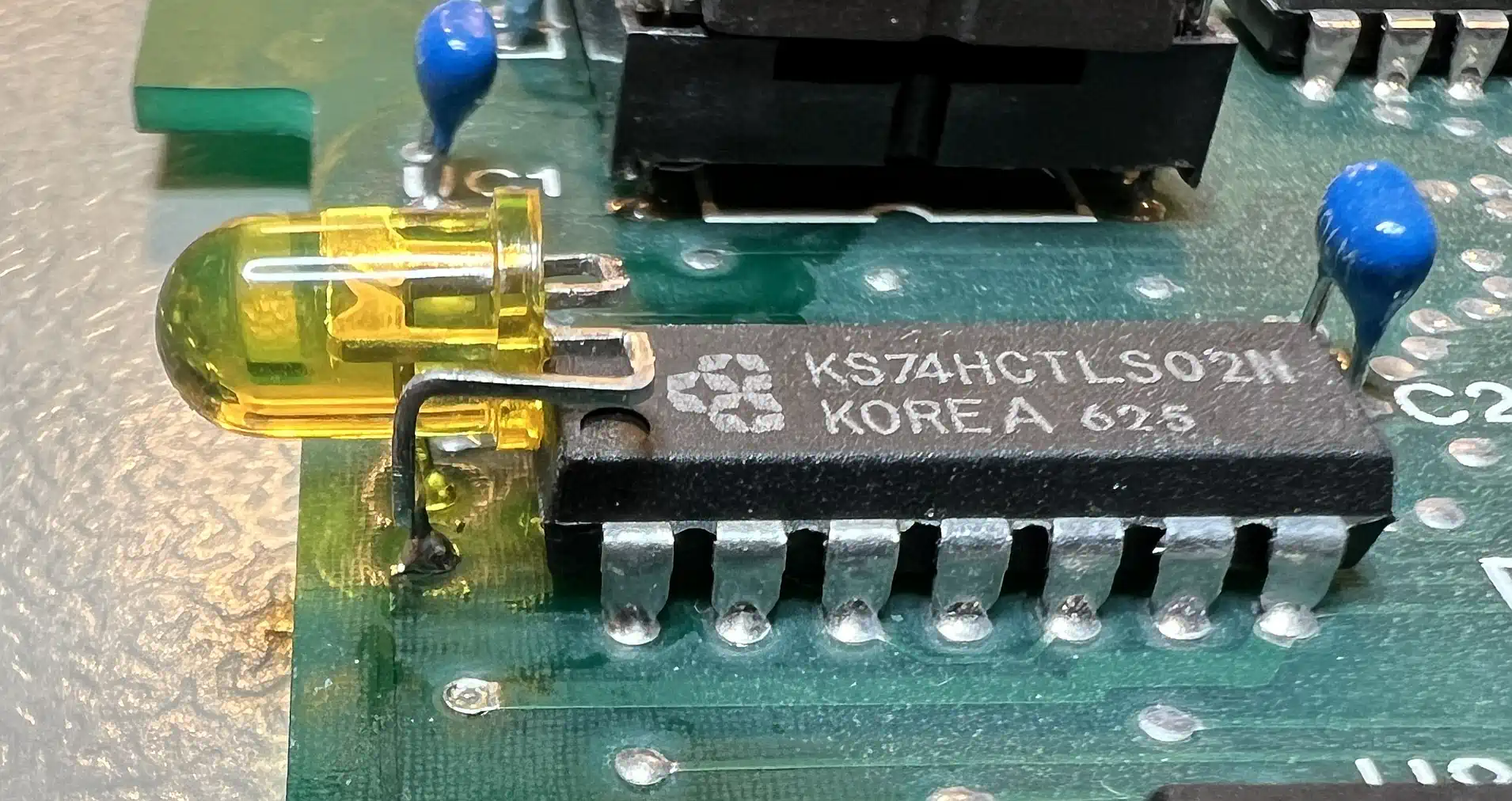 Every PEB card has to light up when accessed - basta! This one feels too elite for doing this - fun fact is, that the reason is similar to the LED issue with the TIPI-PEB - a PCB layout bug, no one felt responsible to solve! Enough room on the PCB to carry LED and resistor is there - more you can read here. In the pictures to the right you can see my implementation. Addendum: The LED is not to extend over the edge of the board towards the front - I had to bent it back a bit after taking the photo. |