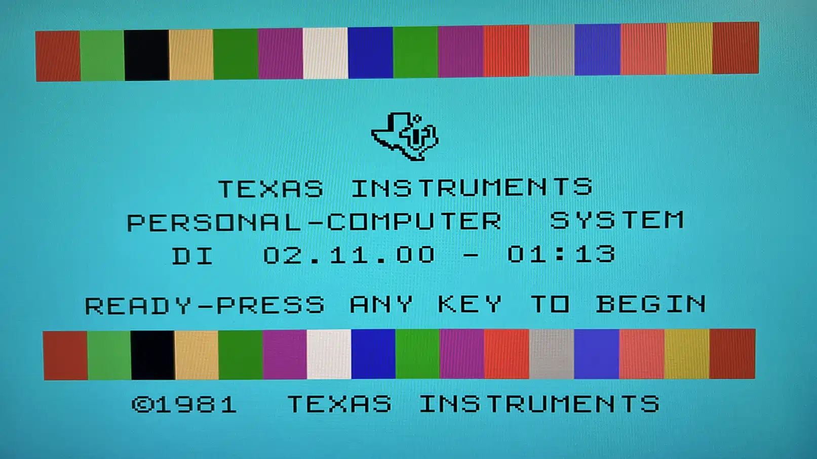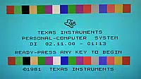 In any case: somewhere else! I'd prefer the charactor row below the colour bar - left hand side the date, right hand side the time - each of them aligned with its outer screen boundary. Lets see... but the presumptuous "Personal Computer System" - we don't honestly need this, don't we - although at TI in those times, they often used it themselves. |