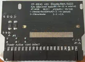 Die gesamte Adress- und CRU-Decodierung wird - wer hätte das gedacht - vom CPLD erledigt. Bei der Software wird es spannender, denn der Inhalt der Karte ist z.B. auf einem PC nicht ohne weiteres lesbar. Das CF-Betriebssystem unterteilt die ganze Karte in 800KB große logische Volumes, und adressiert die einzelnen Sektoren der Karte direkt - dabei verwendet es einen Offset, der sich aus der laufenden Volume-Nummer ergibt, und der anhand der virtuellen Geometrie auf die Spuren (40), Seiten (2) und Sektoren pro Spur (20) umgerechnet wird. Näheres zeigt ein Blick in den Quellcode, den der Autor Jaime Maililong als 'Abschiedsgeschenk' gestiftet hat... Die Sektoren einer CF-Karte sind 512 Bytes groß, die CF-DSR verwendet davon nur die erste Hälfte, angeblich weil der Decodieraufwand der CF-Hardwareansteuerung begrenzt werden sollte... naja - am Ende wird halt nur die Hälfte des verfügbaren Platzes genutzt - siehe oben, there's plenty! Die tatsächlichen 'Disketten' sind immer 400KB groß, haben also 1600 Sektoren (es sei denn man erzeugt Volumes mit externen Tools - die DSR passt sich der Größe an), womit das TI-Filesystem voll ausgenutzt wird ohne inkompatibel zu werden. Jedes der Volumes kann auf eines der 3 Diskettenlaufwerke DSK1, DSK2, DSK3 ge'mountet' werden, wobei der 'Mount Point' von DSK1 separat auf der CF-Karte gespeichert und beim Neustart wiederhergestellt wird. Auf der Anwenderseite stehen die 3 Befehle CALL MOUNT(), CALL UNMOUNT() und CALL FORMAT() zur Verwaltung der CF-Volumes zur Verfügung, neben CALL FILES() (sowie allen bekannten Level-2-Routinen, wodurch alle Diskmanager funktionieren sollten). Die Verwendung der 'CALLs' wird im (zugegeben nicht preisverdächtigen) Handbuch erklärt - deshalb spare ich mir hier die Wiederholung. | |||