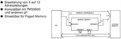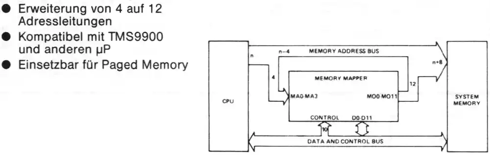 Der LS612 besitzt transparente Tri-State Ausgänge. Das Funktionsprinzip ist so einfach wie undurchsichtig... wobei sich der LS612 zwischen den Adressbus der CPU und einen um ein vielfaches größeren Speicher stellt, in dem er den originären Speicher der CPU abbildet. Er tut dies, indem er die obersten 4 Adressbits eines Mikroprozessors durch bis zu 12 Bits ersetzt, die aus einem von 16 Mapping Registern kommen, welche mit den genannten 4 Bits adressiert werden. Der LS612 ist also im Grunde genommen nur ein schnelles 16x12 RAM (70ns Delay über alles!), dessen Adressierung über 4 Bit erfolgt, und dessen 12 Datenleitungen als zusätzliche Adressleitungen für das erweiterte RAM verwendet werden. Im Fall des TI bzw. des SAMS wird diese Aussage etwas konkreter: